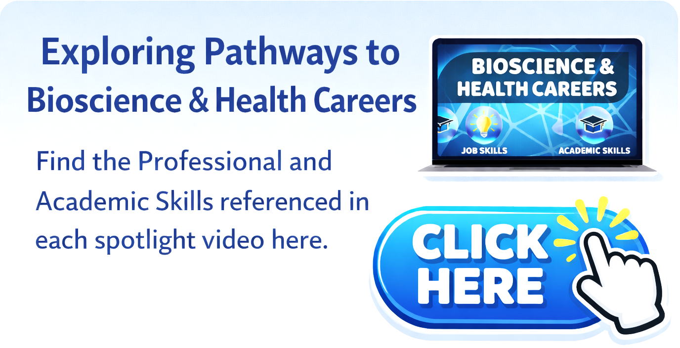 Did you know that interacting with the spotlight videos can earn you credit towards your Professional Development goals? We’re excited to offer three different PD opportunities from the “Exploring Pathways to Bioscience and Healthcare” program.